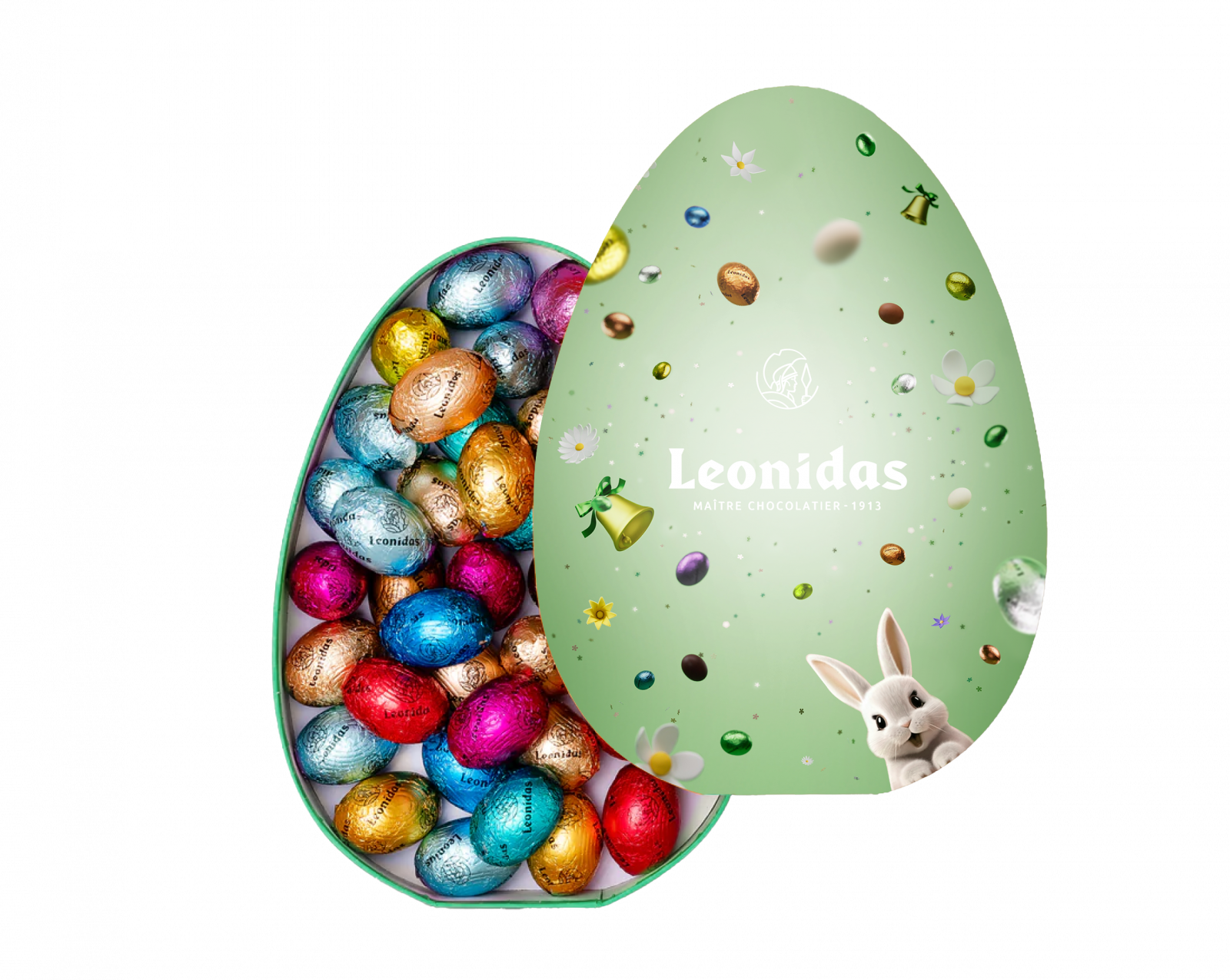 Ingrediente : Sortiment de ouă de ciocolată ambalate individual. Ingrediente: zahăr, unt de cacao, LAPTE praf integral, masă de cacao, ALUNE DE PĂDURE, SMÂNTÂNĂ de LAPTE, sirop cuberdon (sirop de glucoză, glucoză, arome, coloranți: carmin, carbon vegetal), UNT anhidru, LAPTE condensat îndulcit, UNT, sirop de glucoză, zahăr invertit, umectanți (siropul de sorbitol, sorbitol), emulgatori: lecitină de SOIA, lecitină de floarea soarelui) apă, pudră de caramel cu grăsime din LAPTE (LAPTE praf degresat, zer praf (LAPTE), zahăr, grăsime anhidră din LAPTE, vanilie naturală arome), lămâie confiată, făină de GRÂU, MIGDALE, arome) cafea, făină de orez, dextroză, sirop de glucoză-fructoză, pudră de cacao cu conținut scăzut de grăsimi, zahăr din trestie, glicerină vegetală, LACTOZĂ, conservant: sorbat de potasiu, pudră de cacao alcalinizată, zmeură concentrată suc de zmeură, zahăr caramelizat, acid: acid citric, sare, coloranți (sfeclă roșie, complexe de cupru de clorofile, caramel), MIGDALE amare, sare de Guerande, suc concentrat de lămâie, agenți de fermentare (pirofosfat de sodiu, bicarbonat de sodiu), amidon modificat, invertaza , extract de vanilie, dioxid de carbon, agenți de îngroșare (agar-agar, pectină), concentrat vegetal (morcov, hibiscus), pectină, extract de curcumină. Cu ciocolată cu LAPTE (min. 30% substanță uscată de cacao, min. 22% substanță uscată de LAPTE), ciocolată neagră (min. 54% substanță uscată de cacao), ciocolată albă (min. 25% substanță uscată de cacao, min. 22% LAPTE uscat solide), ciocolată albă cu caramel (min. 26% substanță uscată de cacao, min. 27% substanță uscată din LAPTE). Poate contine urme de nuci (fistic, nuci), gluten (orz) si ouă. Se păstrează la loc uscat și răcoros, la o temperatură între 15⁰C – 18⁰C. Produs în Belgia.