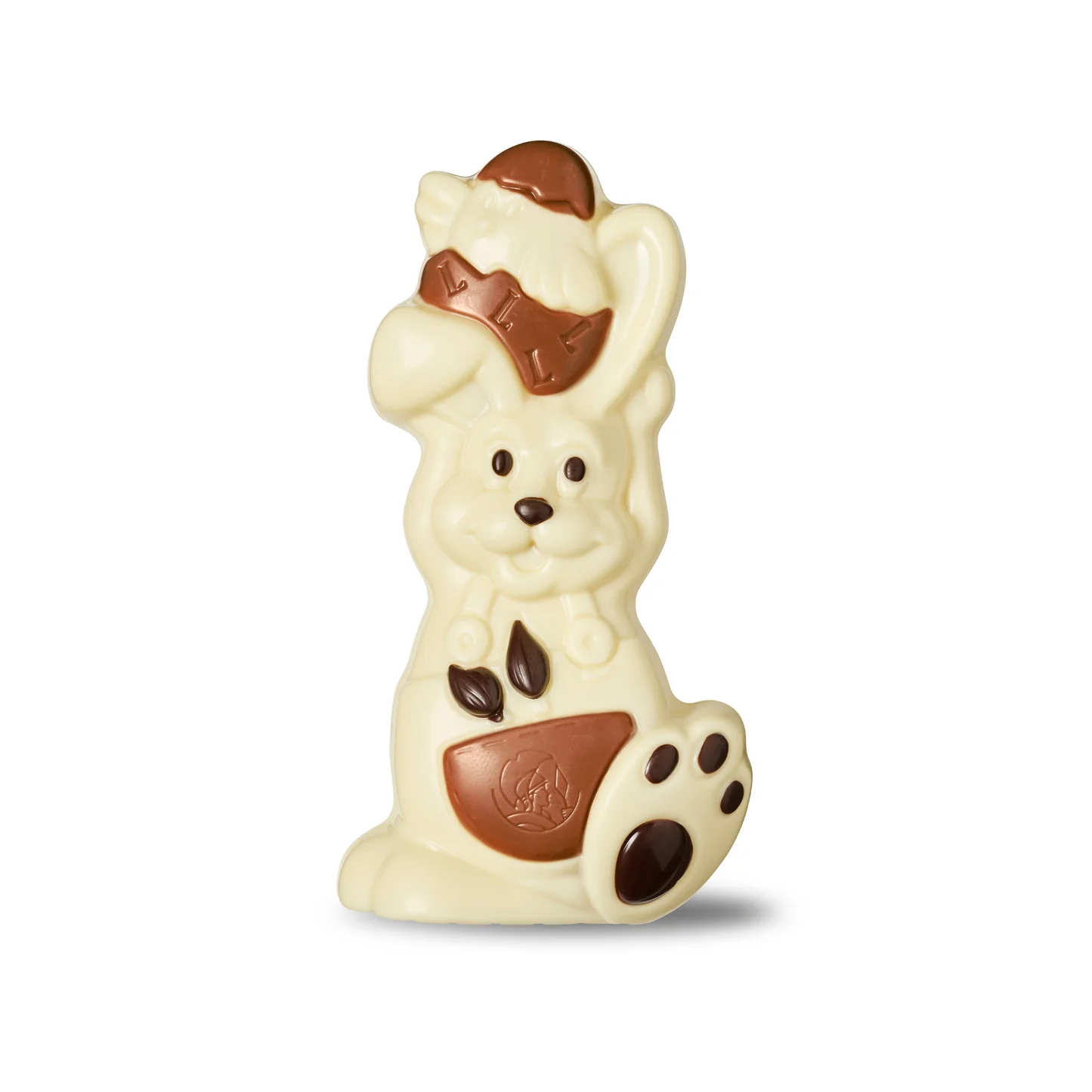 Figurină de Paste colorată, în formă de iepure cu salopetă și pensule de desen și un pui de găină pe cap, din ciocolată albă. Iepurașul de Paște Leonidas este perfect pentru masa în familie sau pentru a fi oferit cadou.