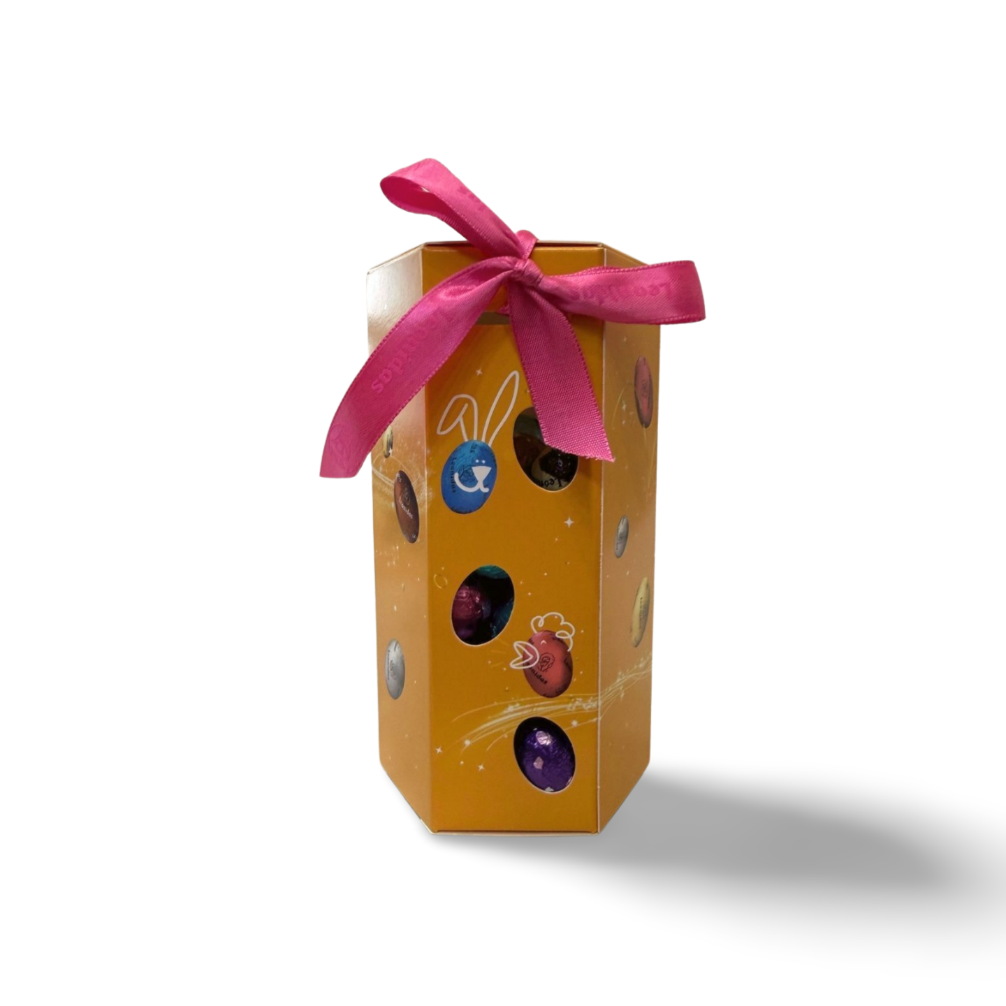 Tube L Paște Leonidas este o cutie cilindrică cu mini-ouă umplute cu diverse creme, din ciocolată cu lapte, neagră și albă și praline ambalate. Pungă cadou Leonidas inclusă.
