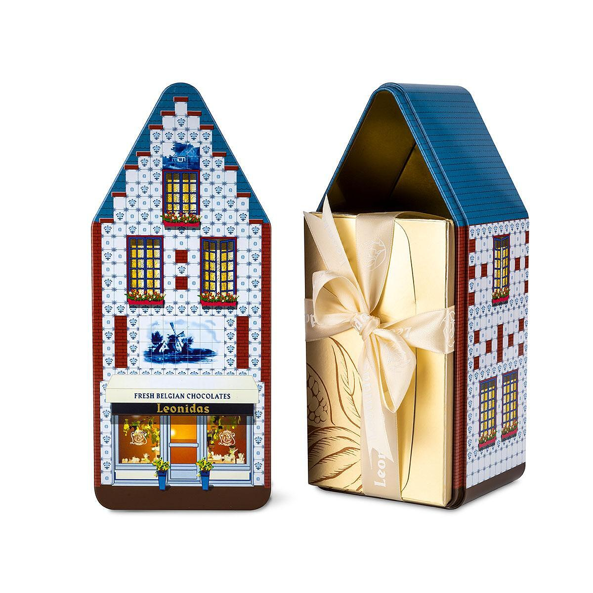 Pentru a vă simți mai aproape de țara de origine a pralinelor Leonidas, am creat special o cutie metalică sub forma unei case tradiționale belgiene.